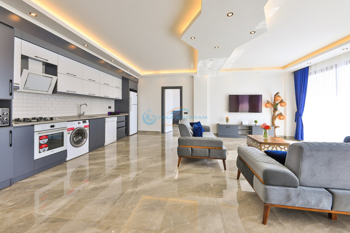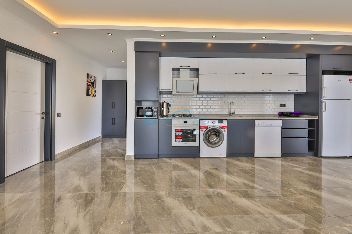 Modern açık mutfak içerisinde buzdolabı, bulaşık makinesi, fırın, ocak, mikrodalga fırın, tost makinesi, yemek masası, yemek takımları, çatal ve bıçak takımları, tencere ve tava takımları, bardaklar bulunmaktadır.