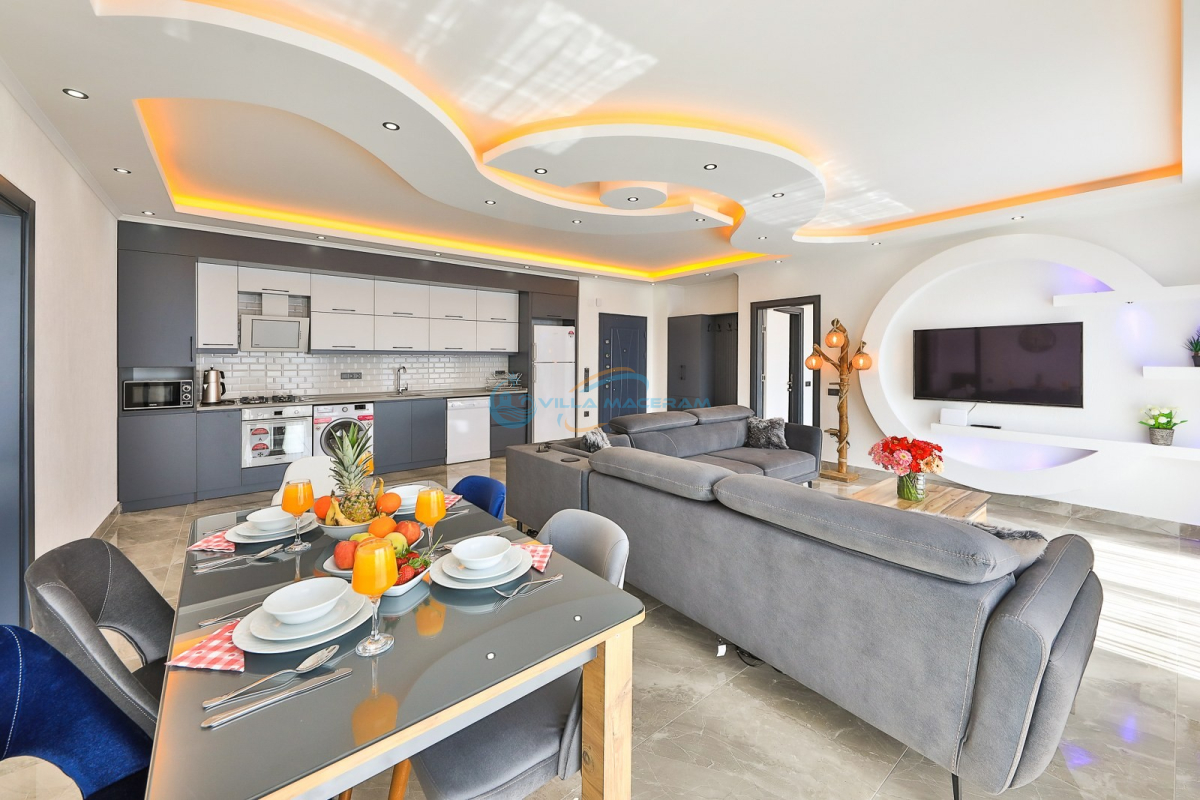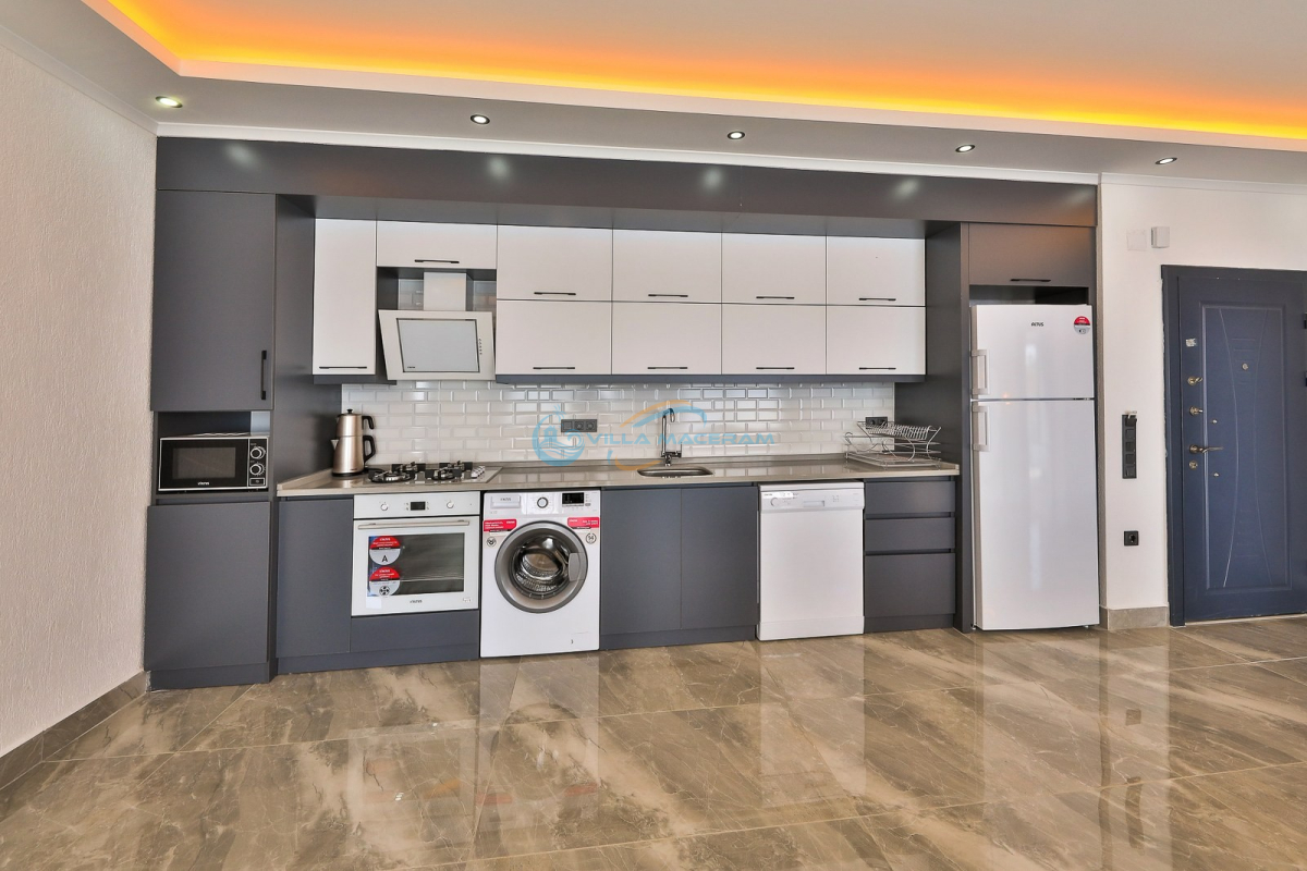 Modern açık mutfak içerisinde buzdolabı, bulaşık makinesi, fırın, ocak, mikrodalga fırın, tost makinesi, yemek masası, yemek takımları, çatal ve bıçak takımları, tencere ve tava takımları, bardaklar bulunmaktadır.